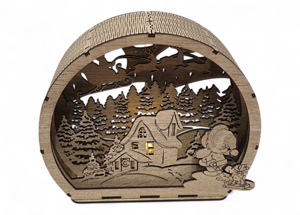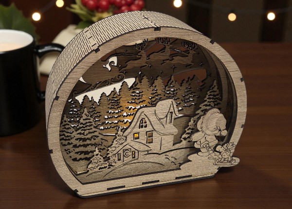 Vďaka vrstvenému 3D efektu pôsobí dekorácia hlboko a pri zapnutí svetielka sa celá scéna mení na magický zimný svet. Výroba je precízna, s krásnymi čistými rezmi a výraznou kresbou dreva.