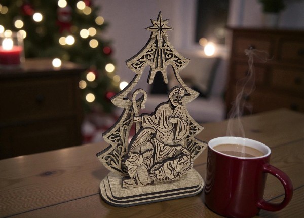 Tento drevený betlehem so Svä­tou rodinou vytvorí doma tú pravú vianočnú atmosféru, ktorá pôsobí tradične, hrejivo a elegantne. Betlehem je vyrezaný z kvalitného dreva s precíznymi detailmi – od jemných línií postáv až po dekoratívny tvar vianočného stromčeka a betlehemskú hviezdu.