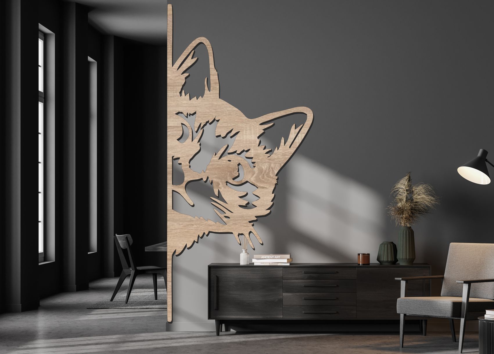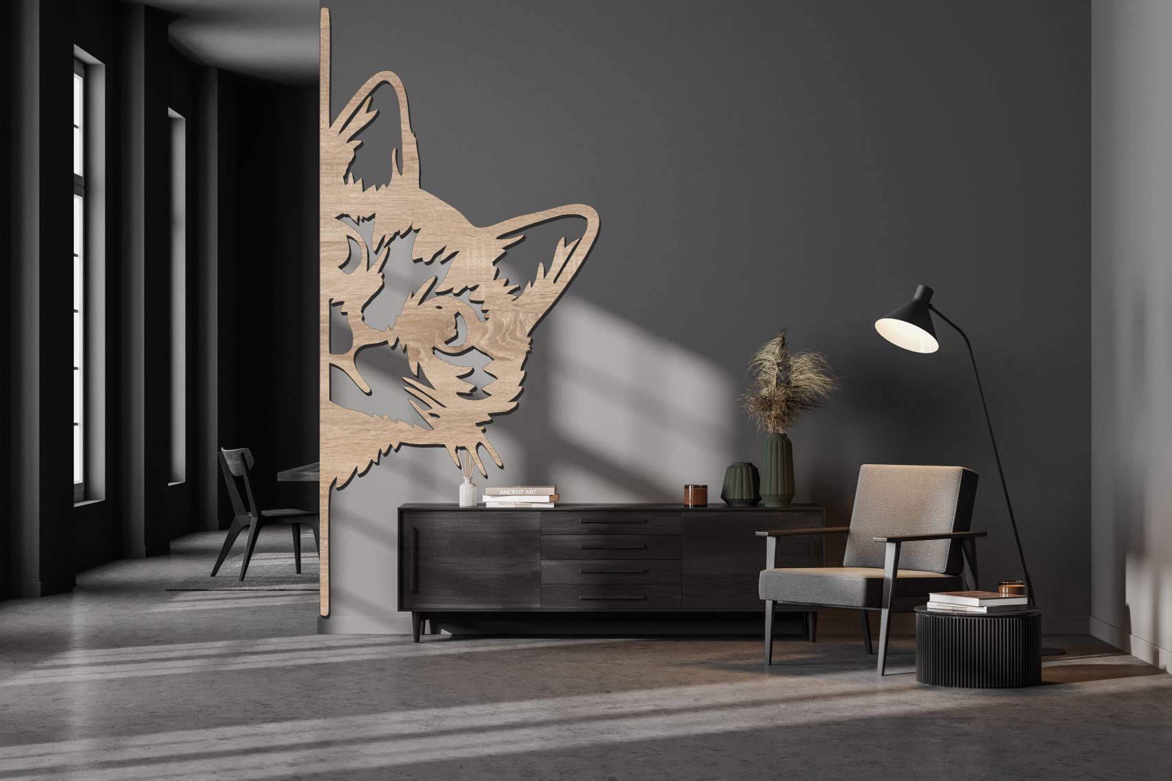 Drevený obraz – Mačka vykúkajúca spoza rohu je moderná, veselá a zároveň minimalistická dekorácia, ktorá okamžite rozžiari každý interiér. Obľubujú ju najmä milovníci mačiek, ale krásne zapadne aj do detských izieb, chodieb, obývačiek či moderných bytov.