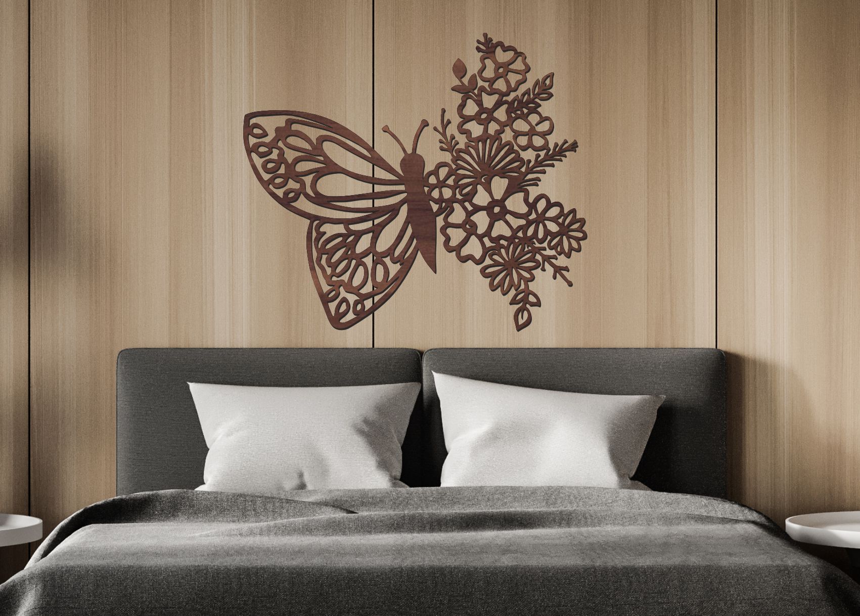Drevený obraz – Motýľ s kvetmi je elegantná a jemná dekorácia, ktorá prinesie do každého interiéru kúsok prírody a harmónie. Motýlie krídla s detailným výrezom a bohato spracovaný kvetinový trs pôsobia luxusne a esteticky, vďaka čomu sa hodí do obývačky, spálne, chodby či pracovného priestoru.