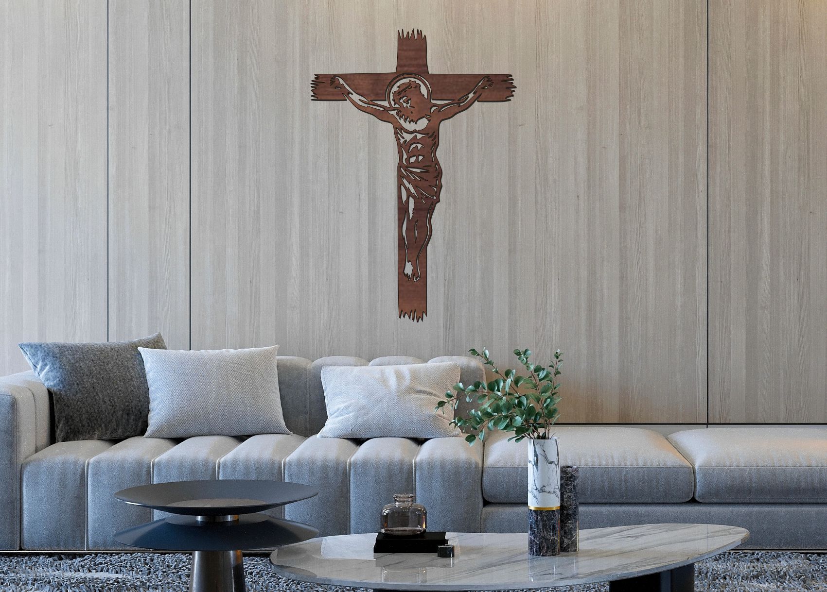 Tento posvätný drevený obraz zobrazuje ukrižovaného Ježiša Krista – symbol obety, lásky a spásy. Je vhodný do domova, kaplnky, kostola či ako darček pre veriacich, ktorí chcú mať duchovný motív vo svojom každodennom živote.