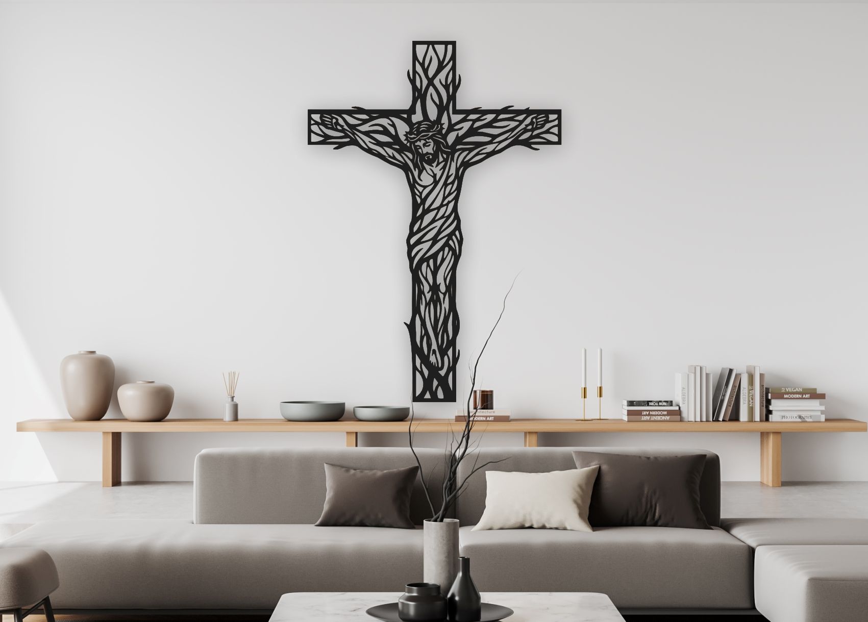 Precízne spracovaný dizajn spája kríž a postavu Ježiša do jedného harmonického umeleckého celku. Detailné laserové rezanie zvýrazňuje jemné línie a vytvára elegantný tieňový efekt na stene.