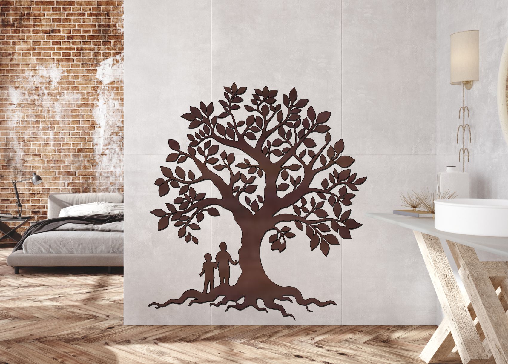 🌳 Drevený strom života na stenu – Rodinné korene je krásna nástenná dekorácia, ktorá vyjadruje silu rodiny, vzájomnú podporu a spoločnú cestu životom. Pod mohutným stromom stoja dve postavy – rodič a dieťa – čo symbolizuje ochranu, vedenie a lásku medzi generáciami. Tento drevený strom života tak predstavuje nielen dekoráciu do interiéru, ale aj silný symbol rodinných hodnôt.